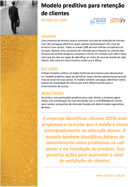 A empresa identificou clientes 325% mais propensos a cancelar que a média e atuou antecipadamente na retenção destes. O modelo também identificou fatores de cancelamento como problemas no call center e na instalação do produto. Isso permitiu ações para aumentar o nível de satisfação do clientes.