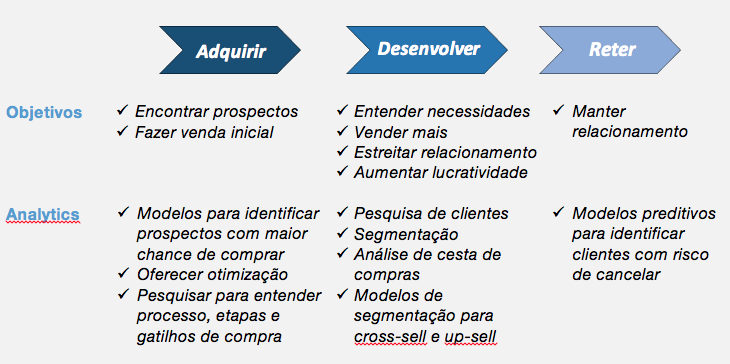 Todo negócio quer encontrar novos clientes, vender mais para clientes existentes e manter seus clientes na base. Muitos dos projetos analíticos realizados são dedicados, portanto, a conhecer melhor a base de clientes e prospectos para fazer previsões sobre comportamento de consumo, cliente a cliente. Muitos destes projetos se estendem ao conhecimento do ciclo de vida de cada cliente para tomadas de decisão.
